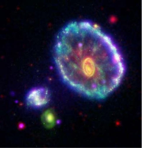 This new image, released on January 11, 2006 from NASA's Galaxy Evolution Explorer completes a multi-wavelength, neon-colored portrait of the enormous Cartwheel galaxy after a smaller galaxy plunged through it, triggering ripples of a sudden, brief star formation. (Photo by NASA/JPL-Caltech/P. N. Appleton/Spitzer Science Center/ Caltech)