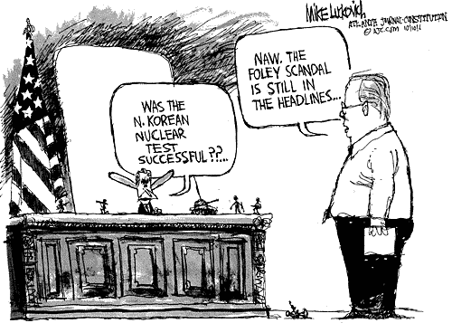 "The Republicans finally got some good news over the weekend. The North Koreans set off a nuclear bomb. Thank God. It was so powerful it knocked the Mark Foley story right off the front page. And knocked him off the page he was on, too." --Jay Leno