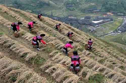 Women from the Hongyao ethnic group work in terraced rice paddies alongside traditional buildings in Longsheng, Guangxi Zhuang Autonomous Region, China, Thursday, Oct. 12, 2006. The Hongyao, are a branch of Yao minority ethnic group. Their buildings, are traditionally decorated with intricate woodcarving and other ethnic designs and are supported by stilt like columns. In recent years, the Hongyao, who cultivate this spectacular terraced landscape have begun to depend increasingly on tourism for their income, leading to an improvement in living conditions for these mountain farmers. (Photo/Color China Photo)