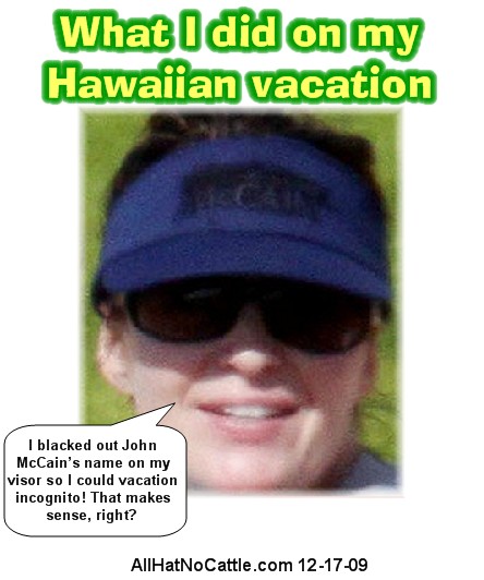 So Sarah blacks out John McCain's name on a visor she's wearing so no one will know who she is. Well, that worked out well. What, the souvenir shops were out of visors? It seems Sarah Palin is as delusional as her followers. No wonder comedians love her.