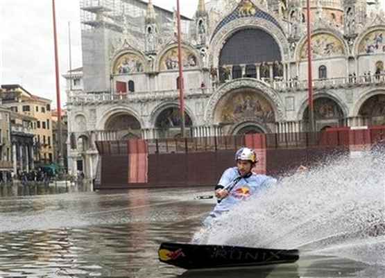 In this image released by the SportandNews agancy, Duncan Zuur of the Netherlands rides on a wakeboard through a flooded St. Marks square in Venice, Italy, Tuesday Dec. 2, 2008. The tidal surge peaked at 3 feet, 4 inches (102 centimeters), well below Monday's 5 foot, 1-inch level (156 centimeters), which marked the fourth highest tide in the city's recorded history and the worst since 1986. Still, the water Tuesday was high enough to flood the city's landmark St. Mark's Square and other low-lying areas. Photo/SportandNews