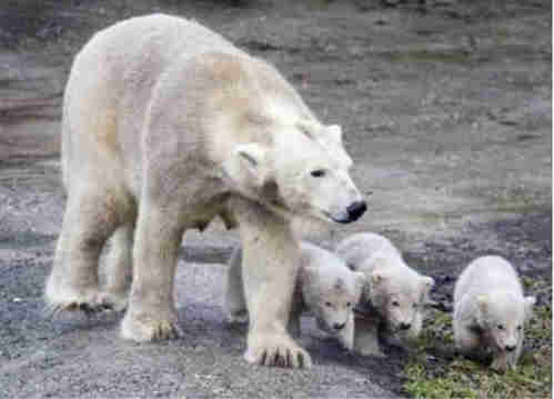Polar bear cubs and their mother Huggies are placed on public display at the Ouwehands Zoo in Rhenen, the Netherlands March 10, 2006. It is the first time a polar bear in captivity has given birth to triplets, the zoo said. The three-month old triplet cubs were put out on public display for the first time Friday. Photo/Michael Kooren