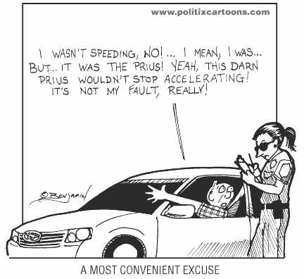 "Toyota is starting to fight back. Today, they cast doubt on the story of that guy — remember the guy last week that said his Prius accelerated out of control on the freeway? They said they found significant inconsistencies in his story. And let me tell you something, that's embarrassing when a car dealer calls you a liar." –Jay Leno