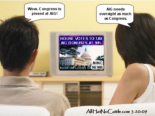 "In his speech yesterday, President Barack Obama lashed out about these excessive bonuses. He said the trouble at AIG was caused by recklessness and excessive greed. But here's the problem. The AIG executives thought it was a compliment. They went, 'Oh, thanks, wow.'" --Jay Leno