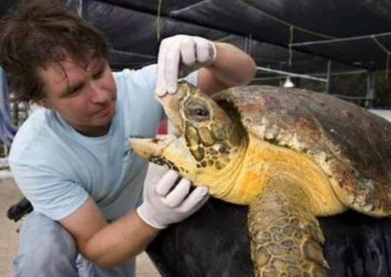 Turtle Hospital, examines the throat of a sick loggerhead sea turtle at the
