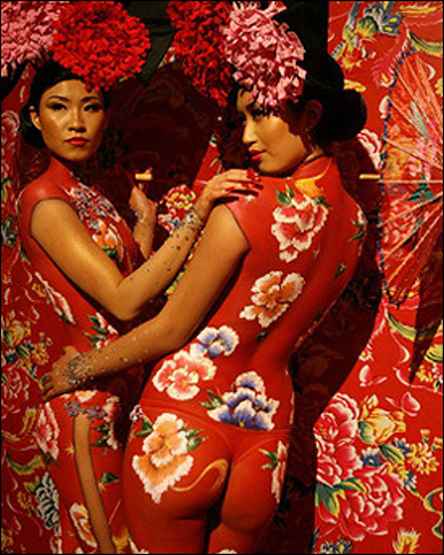 Qi Pao style : Models display body paint at a live exhibition of the Qi Pao, the classic Chinese Dress, to officially launch Australian Fashion Week in Sydney. (Photo/Greg Wood)