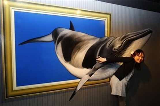 poses in front of an illusionary art work of a whale at the Trick Art Museum at
