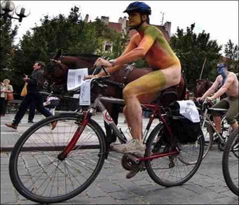 Nude cyclists ride through Prague's Old Town Square as part of "The World Naked Bike Ride," a protest against oil dependency and the ever-increasing number of cars on the road.(Photo-Michal Cizek)
