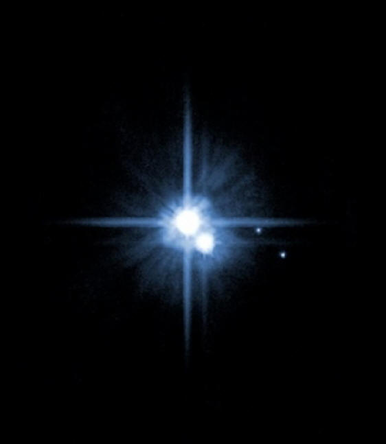 This photo taken by the Hubble Space telescope and released by NASA shows the planet Pluto, center, with its two newly named moons, from far right, Hydra and Nix, respectively. Pluto's other moon, Charon, is seen closest to Pluto. ( Photo/NASA)