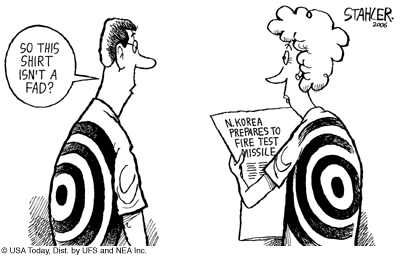 "North Korea's Kim Jong-il ... acknowledged Monday he was developing a nuclear missile program 'to deter attacks from the West.' ... It's called the Taepo-Dong. Before you laugh, you should know that in Korean, that translates to 'kind of penis.'" --Jon Stewart