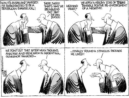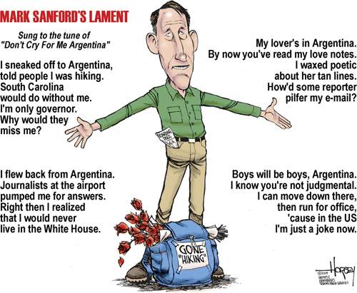 "At a press conference yesterday, in case you don't know, South Carolina Governor Mark Sanford admitted to having a mistress from Argentina. That's right. Yeah, then there was an awkward moment as he waited for someone to give him a high five." --Conan O'Brien