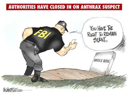 The psychological profile of that government bioterror scientist who just committed suicide — you know, the guy that was going to be charged with the 2001 anthrax mailings, you know this story? Well according to the report, he had a history dating back to his college days of homicidal threats, actions and plans, and that he was a sociopath. Gee, you’d think that kind of background that would have disqualified him from something like, I don’t know, handling anthrax for the government!- Jay Leno