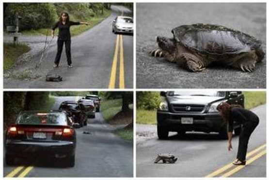 This combination picture shows Rachel Bello guiding a stranded turtle to safety on Walker Road in Great Falls, Virginia, September 27, 2010. A snapping turtle crossing the road forced drivers to detour around it.Photo/Hyungwon Kang