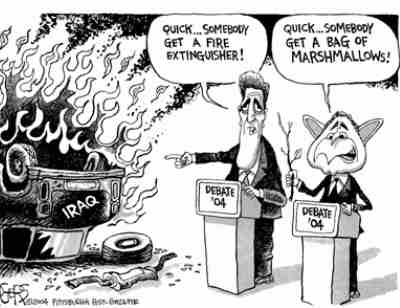 "Before the debate, Bush is concerned about the lectern, he's worried about the room temperature and the lighting. Kerry is making the mistake of worrying about the issues." -- David Letterman