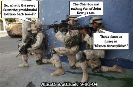 "Of course you know, President Bush has been taking a couple days off this week to prepare for the debates. In fact, he's having a having a microchip implanted in his ear. This will allow Dick Cheney to speak to him directly. 'It's pronounced 'Falloujah' 'Abu Ghraib."' -– Jay Leno