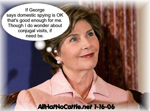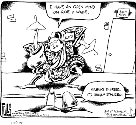 I'm confused. If a man can get a vasectomy without government interference, why can't a woman get an abortion without government interference? For the same reason there are far more ads for Viagra than there are for birth control pills. Are there any government regulations concerning the male reproductive system? Not really. Ours is a society that is still too puritanical, chauvanistic and misogynistic. The real progress in women's rights that has been made on the surface in our country has always been compromised by an undercurrent of sexual discrimination. It's just more subtle here than in some societies. And even that progress is now being threatened as never before. Why wasn't Alito asked these questions? Because too many Democrats feel very comfortable in their role as Republican Lites. And the Republicans? Well, enough said. |