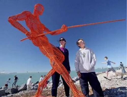 Suzanne Campbell and her son, Kieran, inspect 'Pulling III' a metal sculpture created by Jack Howard-Potter, at the opening of the Sculpture Key West exhibition in Key West, Florida January 15, 2006. About 100 large-scale works in steel, stone, wood, marble and other mediums are on display outside at Fort Zachary Taylor State Park through March 17. (Photo by Rob O'Neal/Florida Keys News Bureau)