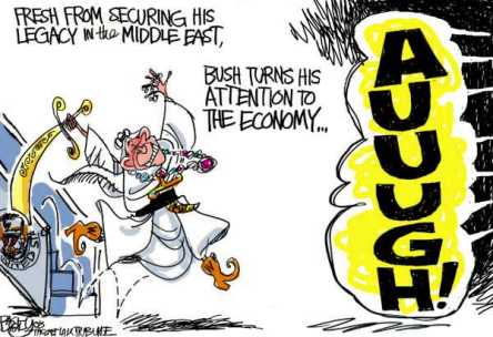 "Are you folks worried about the economy? Stock market crumbling. Everybody's crazy about this. Don't worry. George W. Bush says he's got something in mind to give it a shot in the arm. And if that doesn't work, Cheney is going to give it a shot in the face." --David Letterman
