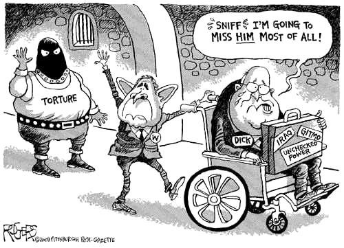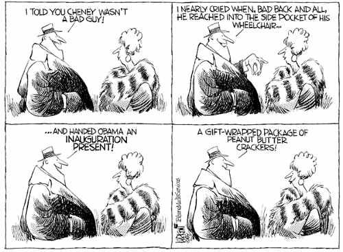 But moving out, Dick Cheney hurt his back. Did you hear about this? He was packing up his junk and moving out of his office, and he hurt himself. So apparently, the door did just hit him in the ass on the way out.- David Letterman