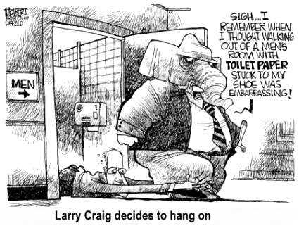"Senator Larry Craig ... has been selected for the Idaho Hall of Fame. Well, what a well thought out choice that was. ... Actually, he's not being inducted into the entire hall, just the men's room" --Jay Leno