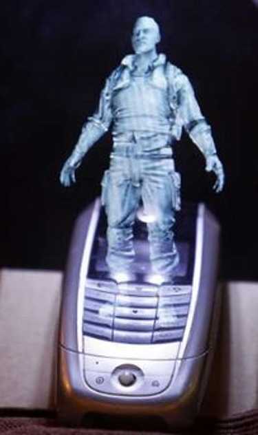 is projected above a mobile phone by a 3D projector (not in picture) displayed