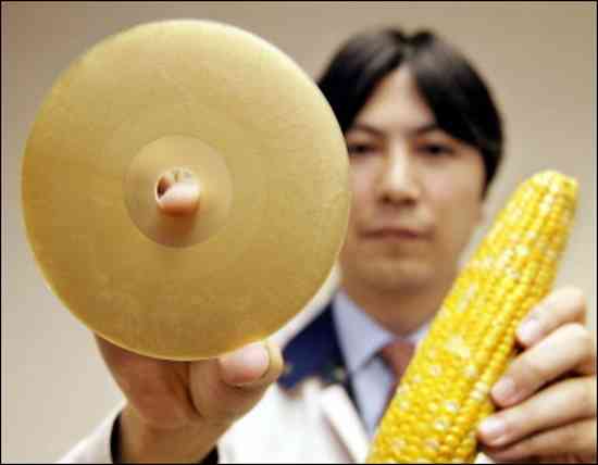 Researcher Tasuo Hosoda of Japanese electronics giant Pioneer displays a prototype model of a blue-ray disc made of corn starch polymer that can store 25 gigabytes of data. The firm says it is an environmentally friendly way for eco-conscious consumers to dispose of CDs after the data stored on them is no longer needed. (AFP/Yoshikazu Tsuno)