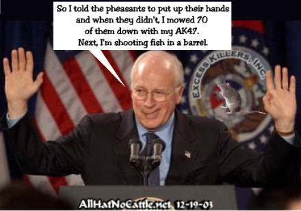 Deadeye Dick Guardian, UK - Dec 16, 2003 ...If shooting defenceless birds can be described as relaxation, it is possible Mr Cheney's expedition was cathartic. After all, he has many worries. His old firm, Halliburton, is accused of profiteering in Iraq. His private contacts with energy industry executives are now subject to a supreme court lawsuit. Far smarter than the present White House incumbent, Mr Cheney harboured presidential ambitions before his heart grew dicky....