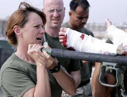 Chief Petty Officer Suzette Dugger of the Navy's Surgical/Shock Trauma Platoon at the U.S. military camp in Taqaddum, Iraq, helps offload a wounded Marine from an ambulance after he was hurt during combat operations against insurgents in the western Iraqi city of Falluja, in this photograph released on Dec. 8, 2004. In the first six days of the U.S.-led offensive, the 63 surgeons, nurses, corpsmen, and other personnel of the platoon treated 157 patients and performed 73 operations. (USMC/Staff Sgt. Jim Goodwin)