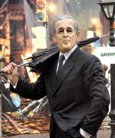 An activist from the environmental group Greenpeace pretends to be U. S. President George W. Bush carrying an umbrella, during a demonstration carried out to warn about the dangers of global warning as the world summit on global climate change continues in Buenos Aires, Argentina, on Dec. 8, 2004. Scientists predict the rise in temperatures will accelerate melting glaciers and polar ice caps, leading to a rise in sea levels, extreme weather like heat waves, the spread of tropical diseases and the collapse of forests, coral reefs and farming. (Greenpeace)