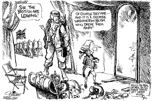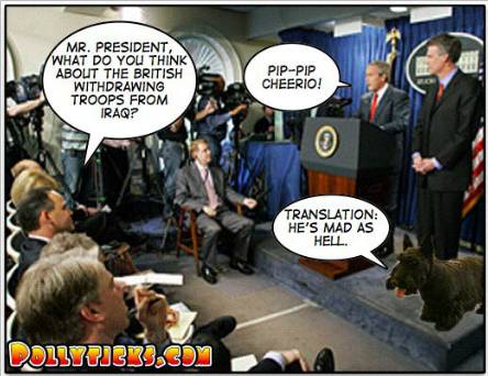 "Bad news for President Bush. He wants us to stay the course, but even our closest ally is saying no. Prime Minister Tony Blair announced the withdrawal of 1,500 British troops and says that more than half of their troops could be pulled by this summer. Coincidentally, the announcement comes the day after Prince Harry volunteered to go fight over in Iraq. Maybe that's the way to get our troops out -- we send Billy Bush to Iraq." --Jimmy Kimmel