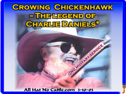 As a Democrat I feel Charlie Daniels has the right to express his pro war views -- this is America, right? The Constitution doesn't protect people from making fools of themselves like good ole boy Charlie. I just love these right wing chickenhawks beating the war drum or in Charlie's case plucking the chickenhawk guitar. It made today's cartoon an easy choice.