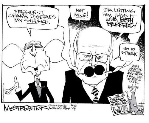 "Speaking of which, he did not disappoint [on screen: Cheney saying that Obama's actions since he took office have made Americans less safe]. I trust you. So, sir, is that based on you reading the intelligence reports? [on screen: Cheney saying he doesn't read the intelligence reports anymore]. Oh, well then, maybe I could interest you in a hot cup of shut-the-f***-up." --Jon Stewart