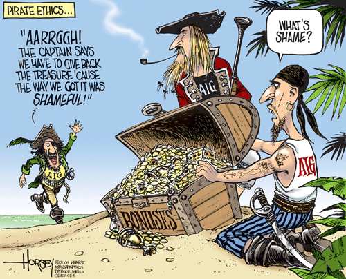 In worthless drain on taxpayer money news, insurance giant A.I.G.. is on the hot seat because after they took billions of dollars in bailout money, they gave $165 million out in bonuses to their executives. So now, lawmakers are demanding that they give the money back. The problem, though, is that legally they’re entitled to the money so it’s a dilemma. But I have an idea I think might satisfy all of us and also adhere to the letter of the law. I say, instead of mailing the bonus checks to their houses, we put rocks on them and we put them at the bottom of an enormous piranha tank. We set it up in the middle of Times Square. You want the money, swim. There it is.- Jimmy Kimmel