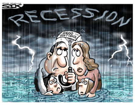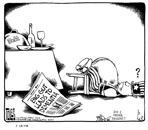 "And at a speech earlier today in Sterling, Virginia, President Bush said the economy is going through a rough patch, but he's confident things will work out. Unless you own a home, own a car, have stock, or you're over 65." --Jay Leno