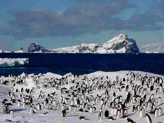 Penguins on an ice floe in the Antarctic near New Zealand. The penguins are looking for weapons of mass destruction.