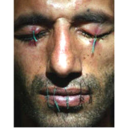Iranian asylum-seeker Abas Amini sits with his eyes, mouth and ears sewn up, at his home in Nottingham in northern England, May 27, 2003.