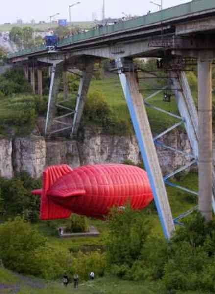 A hot air balloon flys under a bridge during an international balloon cup in the Ukrainian city of Kamyanets-Podilsky, west of the capital Kiev, May 22, 2004. (HO)