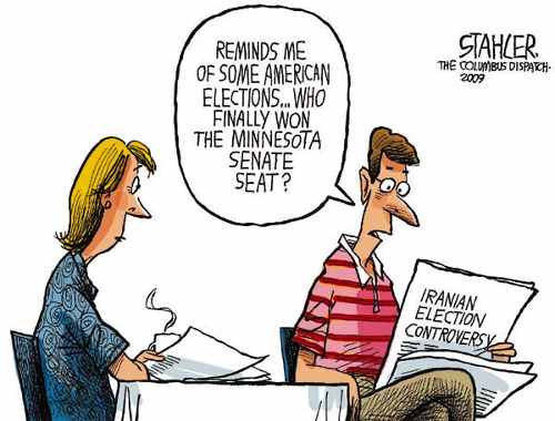 "It's a little different over there when they have an election in Iran, because the women, they get to vote over there. Unlike our ally Saudi Arabia. But in Iran, the women get to vote and it's great, because they're already wearing the booth." --Bill Maher