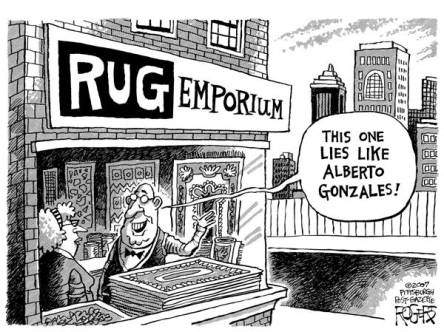 "A new survey says that 58% of the people who follow the news think Attorney General Alberto Gonzales should resign. Of course, President Bush is not in that group. You know ... of people who follow the news. ... This whole administration is turning into a bad version of 'Wizard of Oz.' Cheney needs a heart. Gonzales needs some courage. Bush needs a brain." --Jay Leno