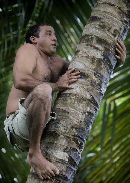 In this photo taken Wednesday Aug. 24, 2011, Yoandri Hernandez Garrido, 37, known as "Twenty-Four," climbs a palm tree in Baracoa, Guantanamo province, Cuba. Hernandez is proud of his extra digits and calls them a blessing, saying they set him apart and enable him to make a living by scrambling up palm trees to cut coconuts and posing for photographs in this eastern Cuban city popular with tourists. Known as polydactyly, Hernandez's condition is relatively common, but it's rare for the extra digits to be so perfect. Photo/Javier Galeano