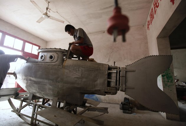 A worker polishes the surface of an unfinished miniature submarine at a workshop of Zhang Wuyi, a local farmer who is interested in scientific inventions, in Qingling village, on the outskirts of Wuhan, capital of central China's Hubei province August 29, 2011. Zhang has successfully tested his self-made miniature submarine "Shuguang Hao", which is 3.6 m (12 feet) long, 1.8 m (6 feet) high, has a maximum diving depth of 20 m (65 feet), can travel at a speed of 20 km per hour for 10 hours underwater and is shaped as a dolphin. "I hope to sell my submarine as a civil product with the price of about 100,000 yuan ($15,670) after safety tests, and a merchant has decided to order one in this month", Zhang said. Photo/Jason Lee