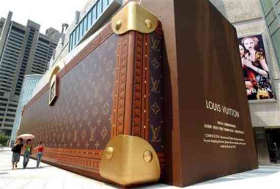People walk past a big luggage-like advertisement for Louis Vuitton items at the boutique under the direct management of Louis Vuitton in Shanghai, China, on Tuesday. (Eugene Hoshiko)